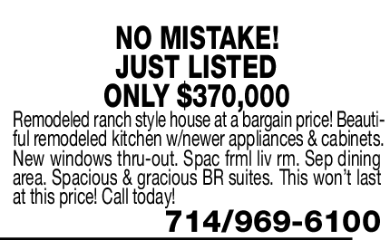 M.V. NO MISTAKE! JUST LISTED ONLY $370,000 Remodeled ranch style house at a bargain price! Beautiful remodeled kitchen w/newer appliances & cabinets. New windows thru-out. Spac frml liv rm. Sep dining area. Spacious & gracious BR suites. This won’t last at this price! Call today! 714/969-6100 See also