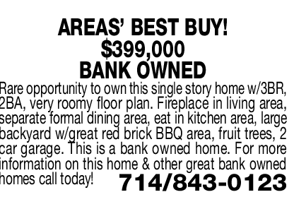 AREAS’ BEST BUY! $399,000 BANK OWNED Rare opportunity to own this single story home w/3BR, 2BA, very roomy floor plan. Fireplace in living area, separate formal dining area, eat in kitchen area, large backyard w/great red brick BBQ area, fruit trees, 2 car garage. This is a bank owned home. For more information on this home & other great bank owned homes call today! 714/843-0123