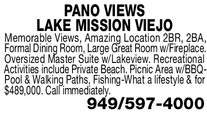PANO VIEWS LAKE MISSION VIEJO Memorable Views, Amazing Location 2BR, 2BA, Formal Dining Room, Large Great Room w/Fireplace. Oversized Master Suite w/Lakeview. Recreational Activities include Private Beach. Picnic Area w/BBQ- Pool & Walking Paths, Fishing-What a lifestyle & for $489,000. Call immediately. 949/597-4000 See also