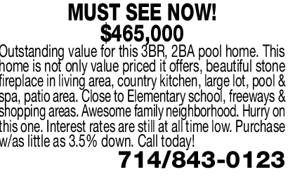 MUST SEE NOW! $465,000 Outstanding value for this 3BR, 2BA pool home. This home is not only value priced it offers, beautiful stone fireplace in living area, country kitchen, large lot, pool & spa, patio area. Close to Elementary school, freeways & shopping areas. Awesome family neighborhood. Hurry on this one. Interest rates are still at all time low. Purchase w/as little as 3.5% down. Call today! 714/843-0123