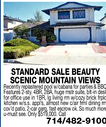 STANDARD SALE BEAUTY SCENIC MOUNTAIN VIEWS Recently replastered pool w/cabana for parties & BBQ. Features 2-sty. 4BR, 2BA, huge mstr suite, blt-in desk for office use in 1BR, lg living rm w/cozy brick frplc, kitchen w/s.s. appl’s, almost new c/air frml dining rm, cov’d patio, 2-car garg, fast escrow ok. So much more u-must see. Only $519,000. Call 714/482-9100