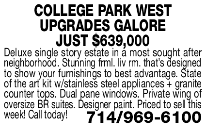 COLLEGE PARK WEST UPGRADES GALORE JUST $639,000 Deluxe single story estate in a most sought after neighborhood. Stunning frml. liv rm. that’s designed to show your furnishings to best advantage. State of the art kit w/stainless steel appliances + granite counter tops. Dual pane windows. Private wing of oversize BR suites. Designer paint. Priced to sell this week! Call today! 714/969-6100