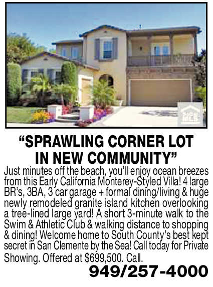 “SPRAWLING CORNER LOT IN NEW COMMUNITY” Just minutes off the beach, you’ll enjoy ocean breezes from this Early California Monterey-Styled Villa! 4 large BR’s, 3BA, 3 car garage + formal dining/living & huge newly remodeled granite island kitchen overlooking a tree-lined large yard! A short 3-minute walk to the Swim & Athletic Club & walking distance to shopping & dining! Welcome home to South County’s best kept secret in San Clemente by the Sea! Call today for Private Showing. Offered at $699,500. Call.