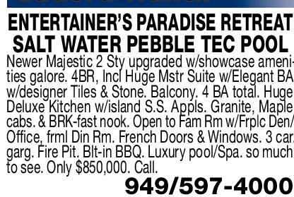 Ladera Ranch ENTERTAINER’S PARADISE RETREAT SALT WATER PEBBLE TEC POOL Newer Majestic 2 Sty upgraded w/showcase amenities galore. 4BR, Incl Huge Mstr Suite w/Elegant BA w/designer Tiles & Stone. Balcony. 4 BA total. Huge Deluxe Kitchen w/island S.S. Appls. Granite, Maple cabs. & BRK-fast nook. Open to Fam Rm w/Frplc Den/ Office, frml Din Rm. French Doors & Windows. 3 car. garg. Fire Pit. Blt-in BBQ. Luxury pool/Spa. so much to see. Only $850,000. Call. 949/597-4000