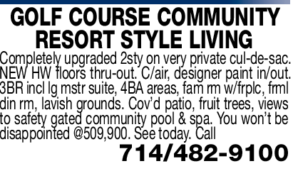 GOLF COURSE COMMUNITY RESORT STYLE LIVING Completely upgraded 2sty on very private cul-de-sac. NEW HW floors thru-out. C/air, designer paint in/out. 3BR incl lg mstr suite, 4BA areas, fam rm w/frplc, frml din rm, lavish grounds. Cov’d patio, fruit trees, views to safety gated community pool & spa. You won’t be disappointed @509,900. See today. Call 714/482-9100