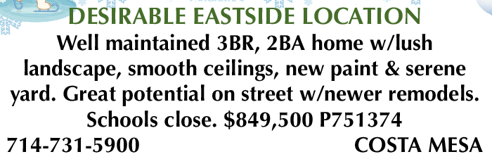 Schools close. $849,500 P751374 714-731-5900 COSTA MESA