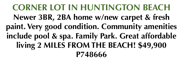 CORNER LOT IN HUNTINGTON BEACH Newer 3BR, 2BA home w/new carpet & fresh paint. Very good condition. Community amenities include pool & spa. Family Park. Great affordable living 2 MILES FROM THE BEACH! $49,900 P748666