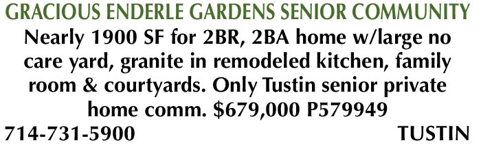 GRACIOUS ENDERLE GARDENS SENIOR COMMUNITY Nearly 1900 SF for 2BR, 2BA home w/large no care yard, granite in remodeled kitchen, family room & courtyards. Only Tustin senior private home comm. $679,000 P579949 714-731-5900 TUSTIN ORIGINAL OWNER SINGLE LEVEL HOME