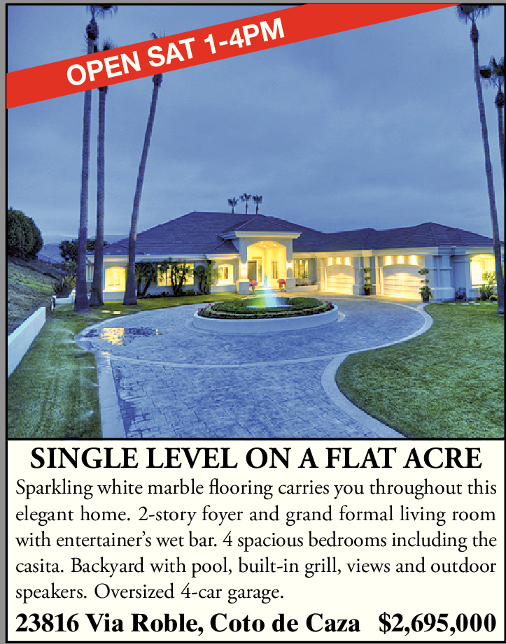 SINGLE LEVEL ON A FLAT ACRE Sparkling white marble flooring carries you throughout this elegant home. 2-story foyer and grand formal living room with entertainer’s wet bar. 4 spacious bedrooms including the casita. Backyard with pool, built-in grill, views and outdoor speakers. Oversized 4-car garage. 23816 Via Roble, Coto de Caza $2,695,000