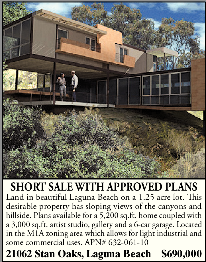 SHORT SALE WITH APPROVED PLANS Land in beautiful Laguna Beach on a 1.25 acre lot. This desirable property has sloping views of the canyons and hillside. Plans available for a 5,200 sq.ft. home coupled with a 3,000 sq.ft. artist studio, gallery and a 6-car garage. Located in the M1A zoning area which allows for light industrial and some commercial uses. APN# 632-061-10 21062 Stan Oaks, Laguna Beach $690,000