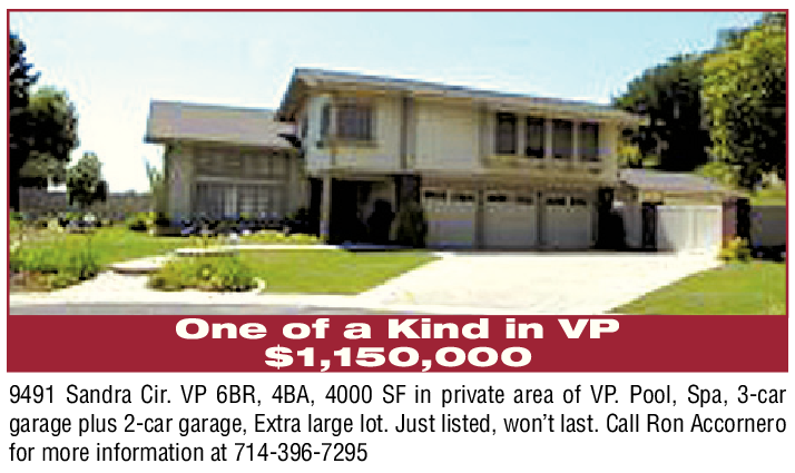 One of a Kind in VP $1,150,000 9491 Sandra Cir. VP 6BR, 4BA, 4000 SF in private area of VP. Pool, Spa, 3-car garage plus 2-car garage, Extra large lot. Just listed, won’t last. Call Ron Accornero for more information at 714-396-7295