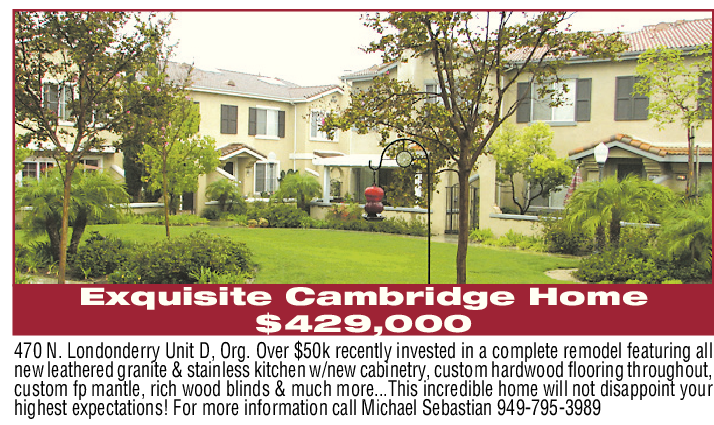 Daniel for more info. 714-931-1032 Exquisite Cambridge Home $429,000 470 N. Londonderry Unit D, Org. Over $50k recently invested in a complete remodel featuring all new leathered granite & stainless kitchen w/new cabinetry, custom hardwood flooring throughout, custom fp mantle, rich wood blinds & much more...This incredible home will not disappoint your highest expectations! For more information call Michael Sebastian 949-795-3989