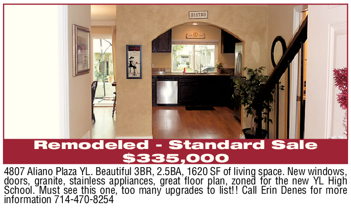 Remodeled - Standard Sale $335,000 4807 Aliano Plaza YL. Beautiful 3BR, 2.5BA, 1620 SF of living space. New windows, doors, granite, stainless appliances, great floor plan, zoned for the new YL High School. Must see this one, too many upgrades to list!! Call Erin Denes for more information 714-470-8254
