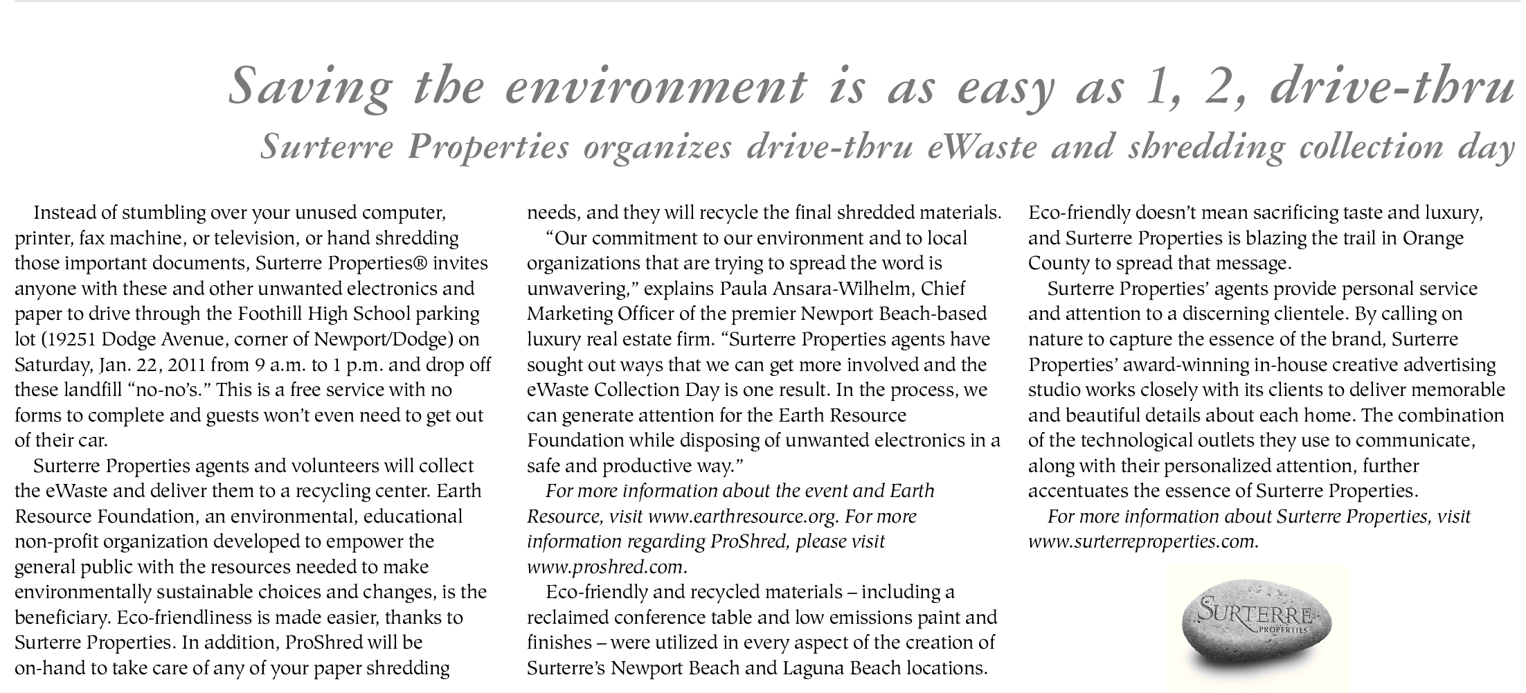 “Our commitment to our environment and to local organizations that are trying to spread the word is unwavering,” explains Paula Ansara-Wilhelm, Chief Marketing Officer of the premier Newport Beach-based luxury real estate firm. “Surterre Properties agents have sought out ways that we can get more involved and the eWaste Collection Day is one result. In the process, we can generate attention for the Earth Resource Foundation while disposing of unwanted electronics in a safe and productive way.”
