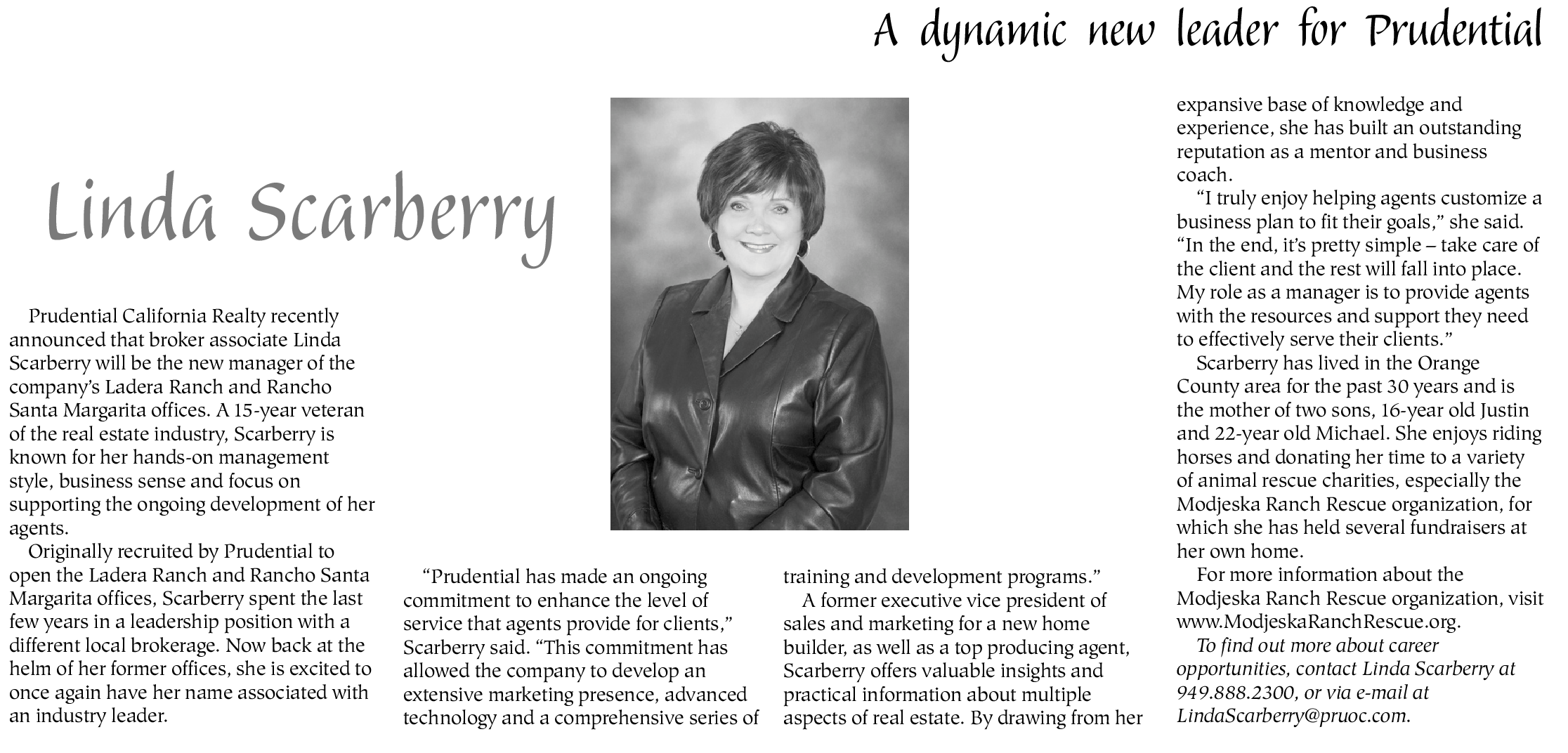 Prudential California Realty recently announced that broker associate Linda Scarberry will be the new manager of the company’s Ladera Ranch and Rancho Santa Margarita offices. A 15-year veteran of the real estate industry, Scarberry is known for her hands-on management style, business sense and focus on supporting the ongoing development of her agents.