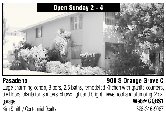 Open Sunday 2 - 4 Pasadena 900 S Orange Grove C Large charming condo, 3 bdrs, 2.5 baths, remodeled Kitchen with granite counters, tile floors, plantation shutters, shows light and bright, newer roof and plumbing. 2 car garage. Web# GQBS1 Kim Smith / Centennial Realty 626-316-9067