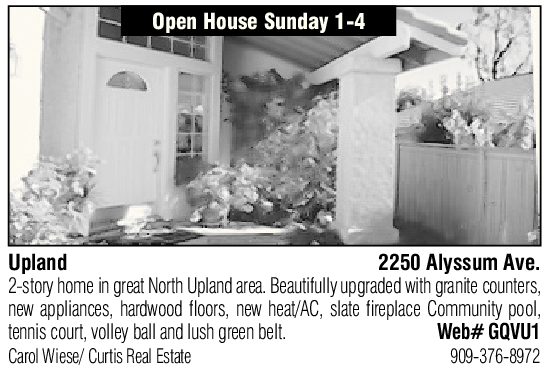Upland 2250 Alyssum Ave. 2-story home in great North Upland area. Beautifully upgraded with granite counters, new appliances, hardwood floors, new heat/AC, slate fireplace Community pool, tennis court, volley ball and lush green belt. Web# GQVU1 Carol Wiese/ Curtis Real Estate 909-376-8972