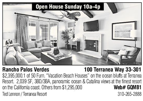 Rancho Palos Verdes 100 Terranea Way 33-301 $2,395,000.1 of 50 Furn. “Vacation Beach Houses” on the ocean bluffs at Terranea Resort. 2,039 SF, 3BD/3BA, panoramic ocean & Catalina views at the finest resort on the California coast. Others from $1,295,000 Web# GQMB1 Ted Lennon / Terranea Resort 310-265-2888