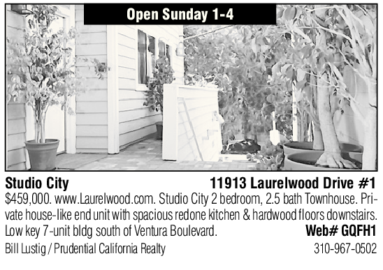 Studio City 11913 Laurelwood Drive #1 $459,000. www.Laurelwood.com. Studio City 2 bedroom, 2.5 bath Townhouse. Private house-like end unit with spacious redone kitchen & hardwood floors downstairs. Low key 7-unit bldg south of Ventura Boulevard. Web# GQFH1 Bill Lustig / Prudential California Realty 310-967-0502