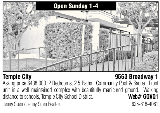 Temple City 9563 Broadway 1 unit in a well maintained complex with beautifully manicured ground. Walking Asking price $438,000. 2 Bedrooms, 2.5 Baths. Community Pool & Sauna. Front distance to schools, Temple City School District. Web# GQVQ1 Jenny Suen / Jenny Suen Realtor 626-818-4061