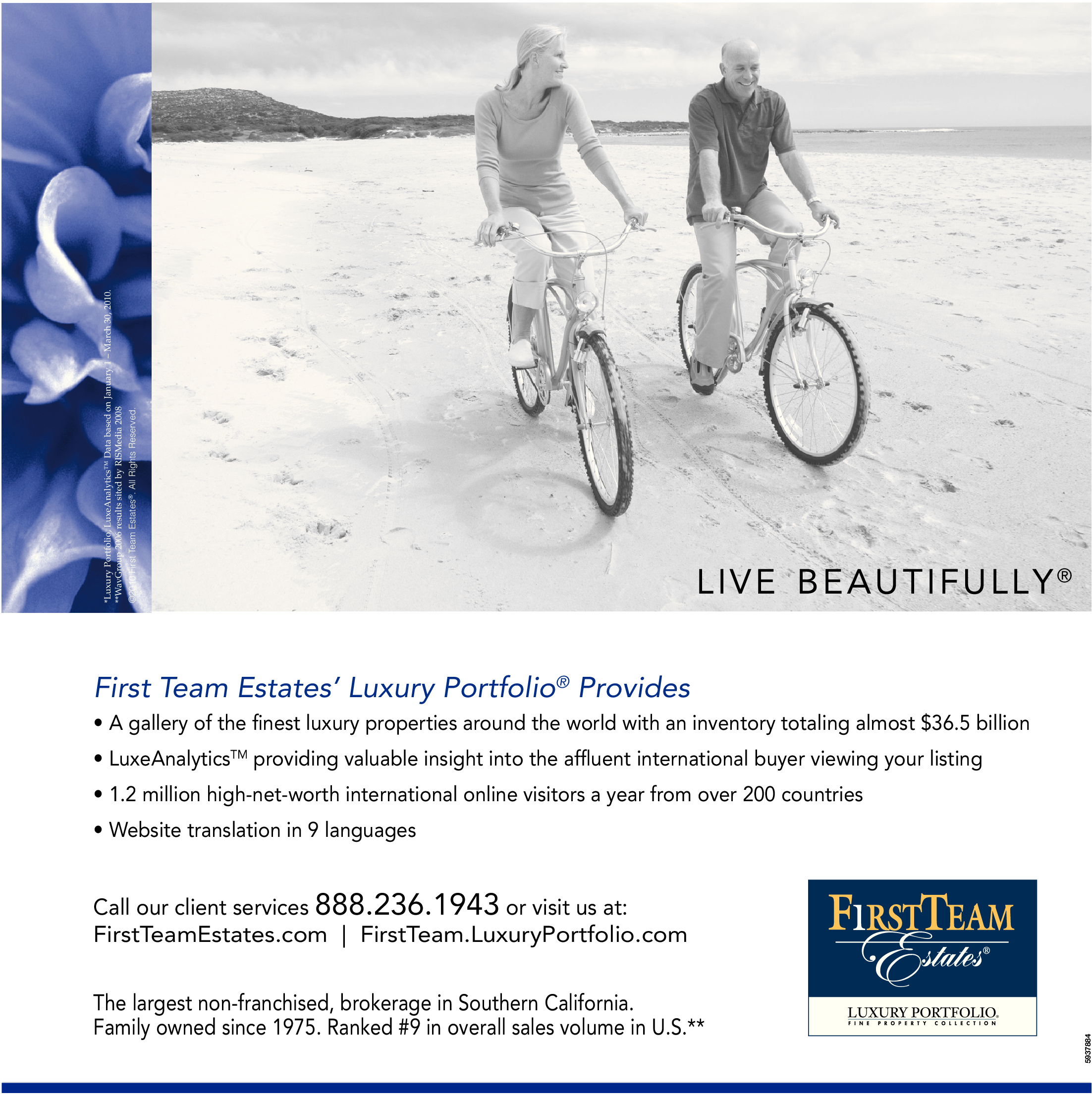 First Team Estates’ Luxury Portfolio ® Provides L I V E B E A U T I F U L L Y ® • A gallery of the finest luxury properties around the world with an inventory totaling almost $36.5 billion • LuxeAnalytics TM providing valuable insight into the affluent international buyer viewing your listing • 1.2 million high-net-worth international online visitors a year from over 200 countries • Website translation in 9 languages Call our client services 888.236.1943 or visit us at: FirstTeamEstates.com | FirstTeam.LuxuryPortfolio.com The largest non-franchised, brokerage in Southern California. Family owned since 1975. Ranked #9 in overall sales volume in U.S.** ®