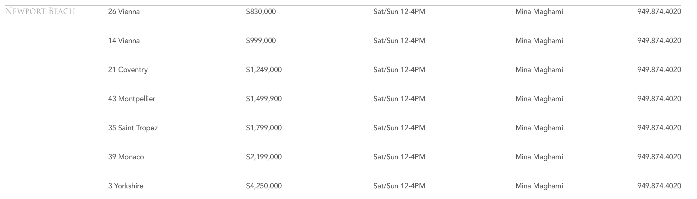 Newport Beach 26 Vienna $830,000 Sat/Sun 12-4PM Mina Maghami 949.874.4020 14 Vienna $999,000 Sat/Sun 12-4PM Mina Maghami 949.874.4020 21 Coventry $1,249,000 Sat/Sun 12-4PM Mina Maghami 949.874.4020 43 Montpellier $1,499,900 Sat/Sun 12-4PM Mina Maghami 949.874.4020 35 Saint Tropez $1,799,000 Sat/Sun 12-4PM Mina Maghami 949.874.4020 39 Monaco $2,199,000 Sat/Sun 12-4PM Mina Maghami 949.874.4020 3 Yorkshire $4,250,000 Sat/Sun 12-4PM Mina Maghami 949.874.4020