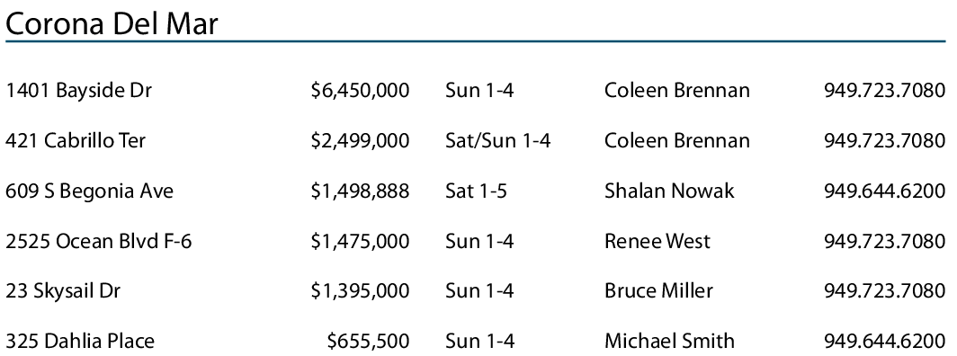 Corona Del Mar 1401 Bayside Dr $6,450,000 Sun 1-4 Coleen Brennan 949.723.7080 421 Cabrillo Ter $2,499,000 Sat/Sun 1-4 Coleen Brennan 949.723.7080 609 S Begonia Ave $1,498,888 Sat 1-5 Shalan Nowak 949.644.6200 2525 Ocean Blvd F-6 $1,475,000 Sun 1-4 Renee West 949.723.7080 23 Skysail Dr $1,395,000 Sun 1-4 Bruce Miller 949.723.7080 325 Dahlia Place $655,500 Sun 1-4 Michael Smith 949.644.6200