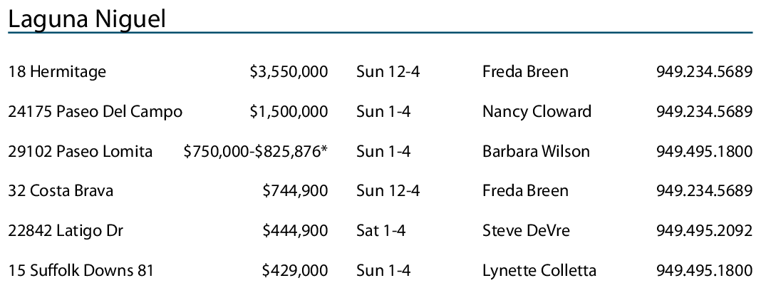 Laguna Niguel 18 Hermitage $3,550,000 Sun 12-4 Freda Breen 949.234.5689 24175 Paseo Del Campo $1,500,000 Sun 1-4 Nancy Cloward 949.234.5689 29102 Paseo Lomita $750,000-$825,876* Sun 1-4 Barbara Wilson 949.495.1800 32 Costa Brava $744,900 Sun 12-4 Freda Breen 949.234.5689 22842 Latigo Dr $444,900 Sat 1-4 Steve DeVre 949.495.2092 15 Suffolk Downs 81 $429,000 Sun 1-4 Lynette Colletta 949.495.1800