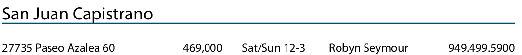 27735 Paseo Azalea 60 469,000 Sat/Sun 12-3 Robyn Seymour 949.499.5900