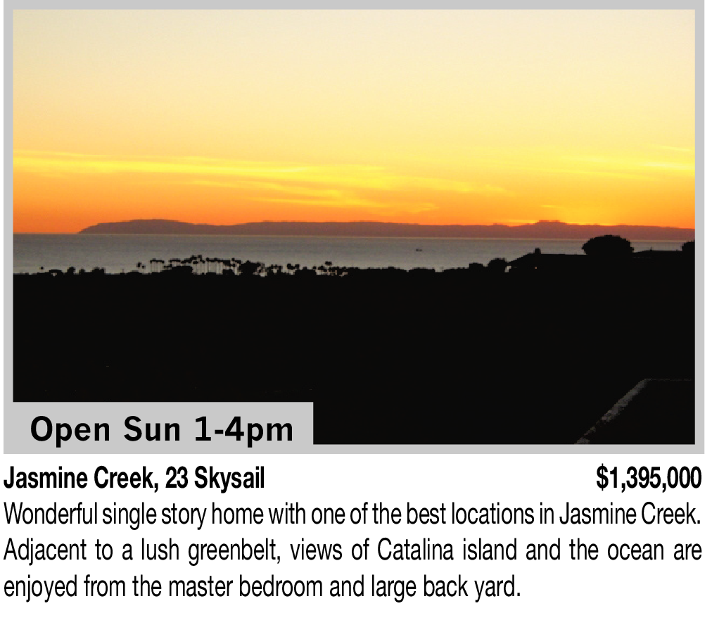 Jasmine Creek, 23 Skysail $1,395,000 Wonderful single story home with one of the best locations in Jasmine Creek. Adjacent to a lush greenbelt, views of Catalina island and the ocean are enjoyed from the master bedroom and large back yard.
