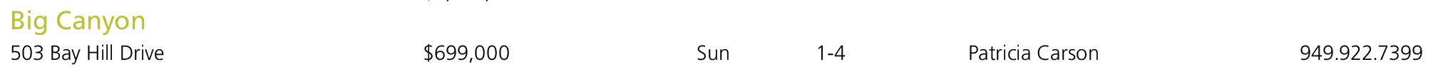 3 Cheshire Court $2,695,000 Sun 1-4 Karen Betson 949.584.5929 Big Canyon 503 Bay Hill Drive $699,000 Sun 1-4 Patricia Carson 949.922.7399