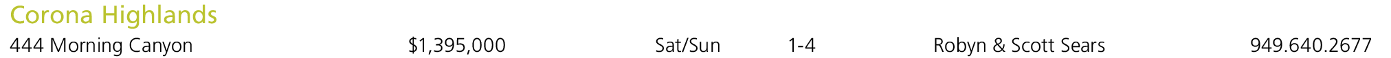 Corona Highlands 444 Morning Canyon $1,395,000 Sat/Sun 1-4 Robyn & Scott Sears 949.640.2677