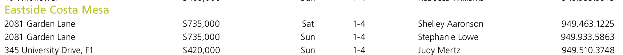 10 Wildflower $409,000 Sun 1-4 Rebecca Williams 949.933.9913 Eastside Costa Mesa 2081 Garden Lane $735,000 Sat 1-4 Shelley Aaronson 949.463.1225 2081 Garden Lane $735,000 Sun 1-4 Stephanie Lowe 949.933.5863 345 University Drive, F1 $420,000 Sun 1-4 Judy Mertz 949.510.3748
