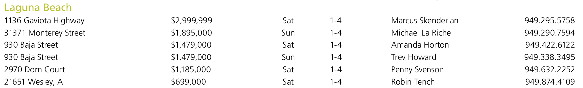 Laguna Beach 1136 Gaviota Highway $2,999,999 Sat 1-4 Marcus Skenderian 949.295.5758 31371 Monterey Street $1,895,000 Sun 1-4 Michael La Riche 949.290.7594 930 Baja Street $1,479,000 Sat 1-4 Amanda Horton 949.422.6122 930 Baja Street $1,479,000 Sun 1-4 Trev Howard 949.338.3495 2970 Dorn Court $1,185,000 Sat 1-4 Penny Svenson 949.632.2252 21651 Wesley, A $699,000 Sat 1-4 Robin Tench 949.874.4109 Lido