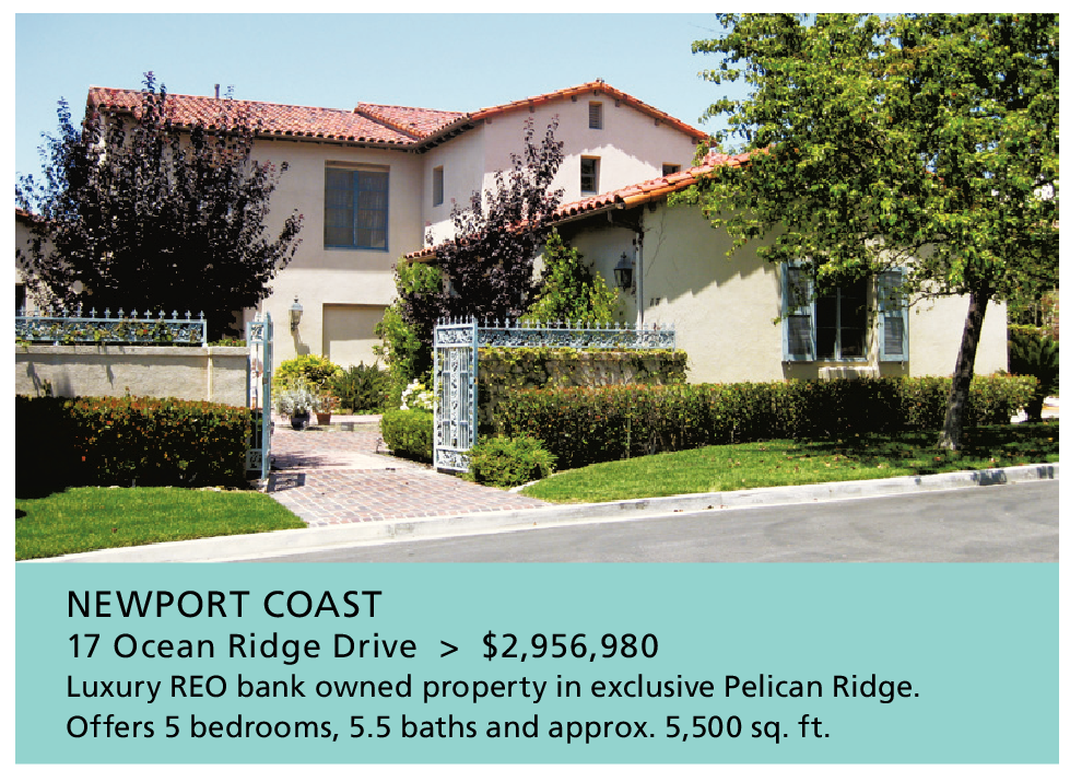 NEWPORT COAST 17 Ocean Ridge Drive > $2,956,980 Luxury REO bank owned property in exclusive Pelican Ridge. Offers 5 bedrooms, 5.5 baths and approx. 5,500 sq. ft.