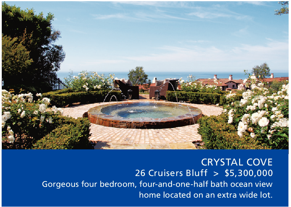 CRYSTAL COVE 26 Cruisers Bluff > $5,300,000 Gorgeous four bedroom, four-and-one-half bath ocean view home located on an extra wide lot.