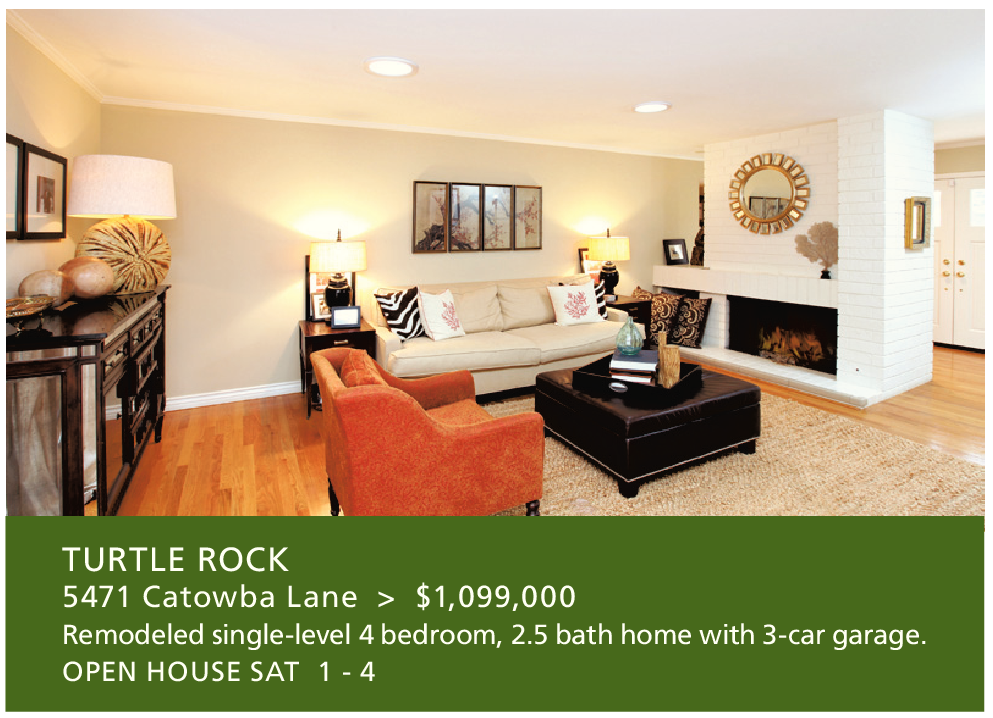 TURTLE ROCK 5471 Catowba Lane > $1,099,000 Remodeled single-level 4 bedroom, 2.5 bath home with 3-car garage. OPEN HOUSE SAT 1 - 4