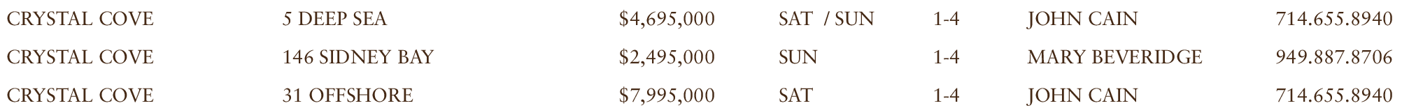 CRYSTAL COVE CRYSTAL COVE CRYSTAL COVE 5 DEEP SEA 146 SIDNEY BAY 31 OFFSHORE $4,695,000 $2,495,000 $7,995,000 SAT / SUN 1-4 SUN 1-4 SAT 1-4 JOHN CAIN MARY BEVERIDGE JOHN CAIN 714.655.8940 949.887.8706 714.655.8940
