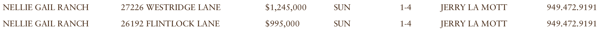 NELLIE GAIL RANCH NELLIE GAIL RANCH 27226 WESTRIDGE LANE 26192 FLINTLOCK LANE $1,245,000 $995,000 SUN 1-4 SUN 1-4 JERRY LA MOTT JERRY LA MOTT 949.472.9191 949.472.9191