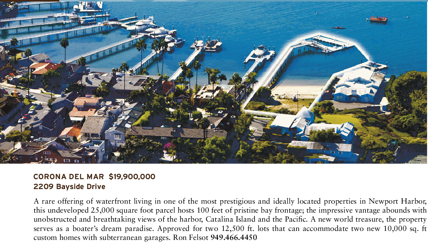 CORONA DEL MAR $19,900,000 2209 Bayside Drive A rare offering of waterfront living in one of the most prestigious and ideally located properties in Newport Harbor, this undeveloped 25,000 square foot parcel hosts 100 feet of pristine bay frontage; the impressive vantage abounds with unobstructed and breathtaking views of the harbor, Catalina Island and the Pacific. A new world treasure, the property serves as a boater’s dream paradise. Approved for two 12,500 ft. lots that can accommodate two new 10,000 sq. ft custom homes with subterranean garages. Ron Felsot 949.466.4450