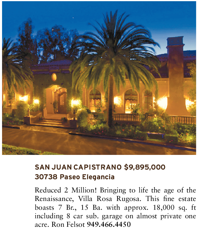 SAN JUAN CAPISTRANO $9,895,000 30738 Paseo Elegancia Reduced 2 Million! Bringing to life the age of the Renaissance, Villa Rosa Rugosa. This fine estate boasts 7 Br., 15 Ba. with approx. 18,000 sq. ft including 8 car sub. garage on almost private one acre. Ron Felsot 949.466.4450
