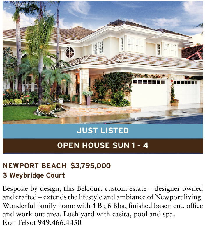 JUST LISTED OPEN HOUSE SUN 1 - 4 NEWPORT BEACH $3,795,000 3 Weybridge Court Bespoke by design, this Belcourt custom estate – designer owned and crafted – extends the lifestyle and ambiance of Newport living. Wonderful family home with 4 Br, 6 Bba, finished basement, office and work out area. Lush yard with casita, pool and spa. Ron Felsot 949.466.4450