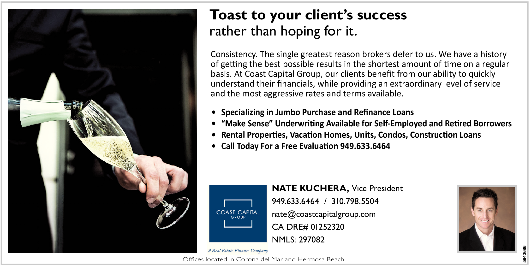 Toast to your client’s success rather than hoping for it. Consistency. The single greatest reason brokers defer to us. We have a history of getting the best possible results in the shortest amount of time on a regular basis. At Coast Capital Group, our clients benefit from our ability to quickly understand their financials, while providing an extraordinary level of service and the most aggressive rates and terms available. • • • • Specializing in Jumbo Purchase and Refinance Loans “Make Sense” Underwriting Available for Self-Employed and Retired Borrowers Rental Properties, Vacation Homes, Units, Condos, Construction Loans Call Today For a Free Evaluation 949.633.6464 NATE KUCHERA, Vice President 949.633.6464 / 310.798.5504 nate@coastcapitalgroup.com CA DRE# 01252320 NMLS: 297082 Offices located in Corona del Mar and Hermosa Beach