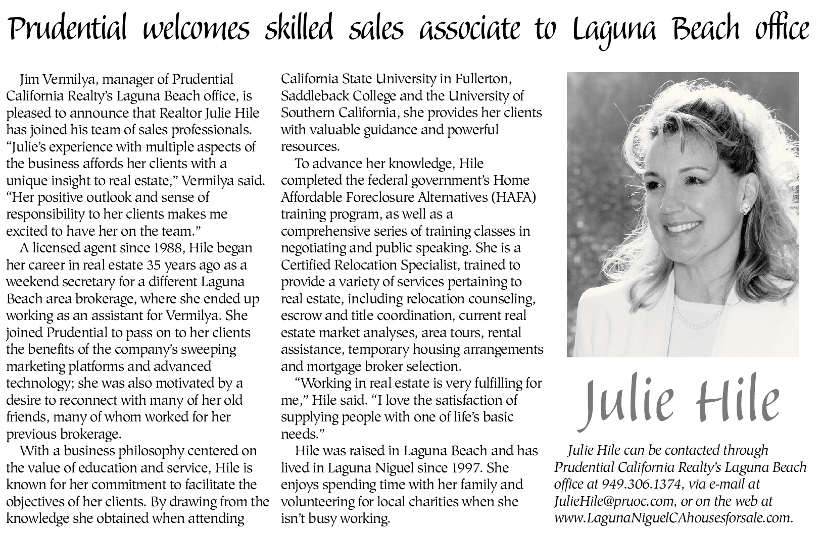Julie Hile can be contacted through Prudential California Realty’s Laguna Beach office at 949.306.1374, via e-mail at JulieHile@pruoc.com, or on the web at www.LagunaNiguelCAhousesforsale.com.