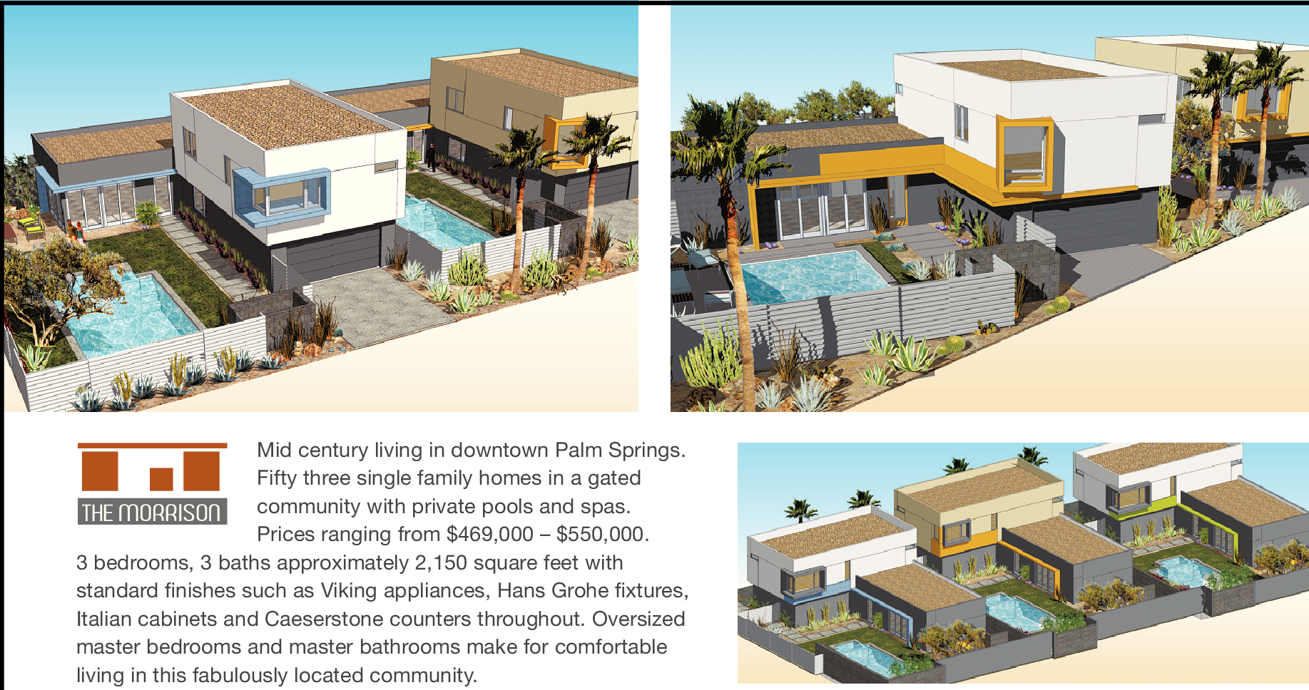 Mid century living in downtown Palm Springs. Fifty three single family homes in a gated community with private pools and spas. Prices ranging from $469,000 – $550,000.