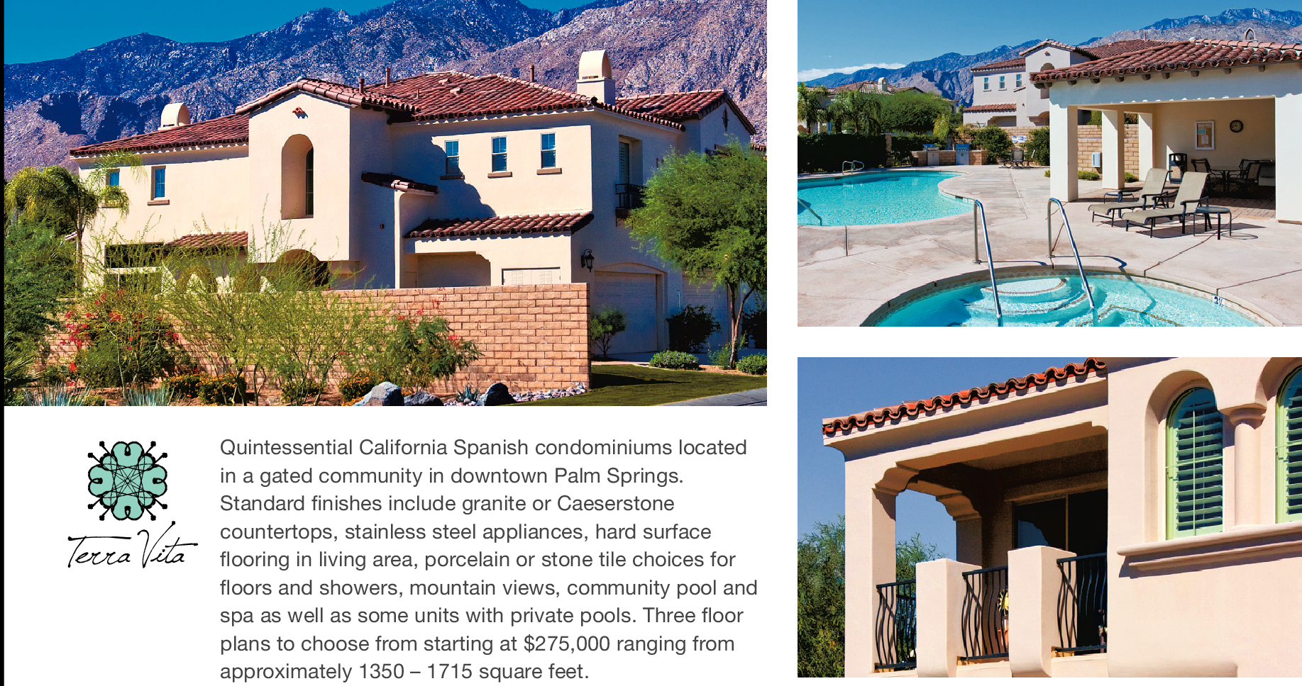 Quintessential California Spanish condominiums located in a gated community in downtown Palm Springs. Standard finishes include granite or Caeserstone countertops, stainless steel appliances, hard surface flooring in living area, porcelain or stone tile choices for floors and showers, mountain views, community pool and spa as well as some units with private pools. Three floor plans to choose from starting at $275,000 ranging from approximately 1350 – 1715 square feet.