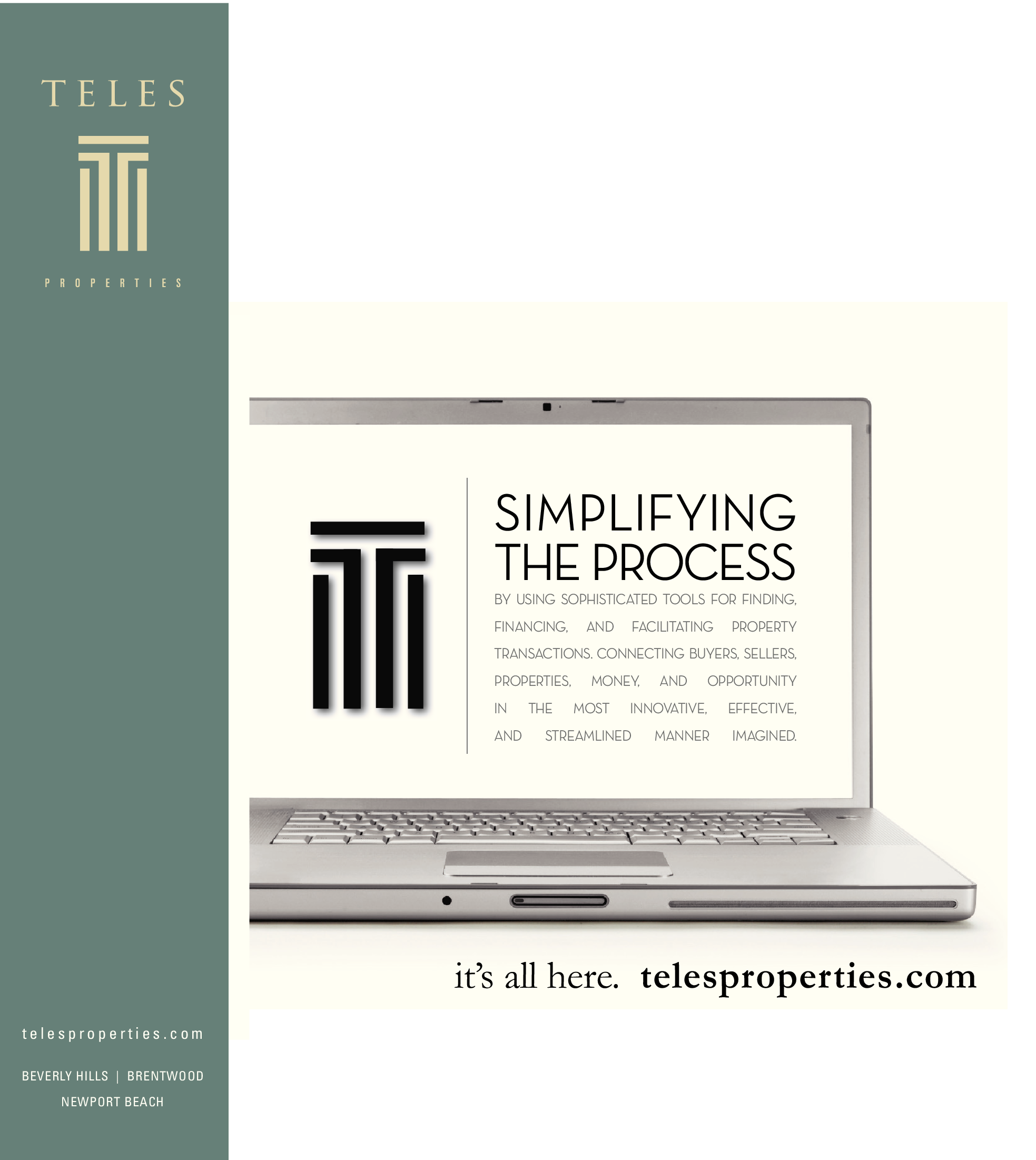 telesproperties.com BEVERLY HILLS | BRENTWOOD NEWPORT BEACH SIMPLIFYING THE PROCESS BY USING SOPHISTICATED TOOLS FOR FINDING, FINANCING, AND FACILITATING PROPERTY TRANSACTIONS. CONNECTING BUYERS, SELLERS, PROPERTIES, MONEY, AND OPPORTUNITY IN THE MOST INNOVATIVE, EFFECTIVE, AND STREAMLINED MANNER IMAGINED. it’s all here. telesproperties.com