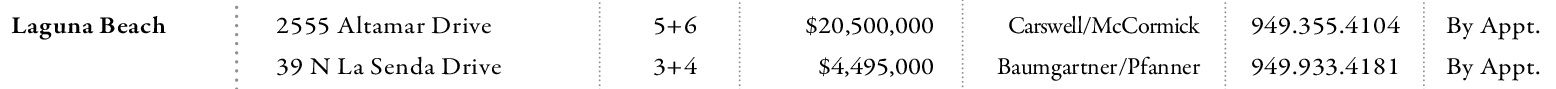 Laguna Beach 2555 Altamar Drive 5+6 $20,500,000 Carswell/McCormick 949.355.4104 By Appt.
