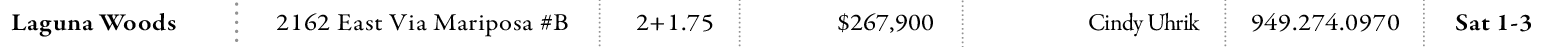 Laguna Woods 2162 East Via Mariposa #B 2+1.75 $267,900 Cindy Uhrik 949.274.0970 Sat 1-3