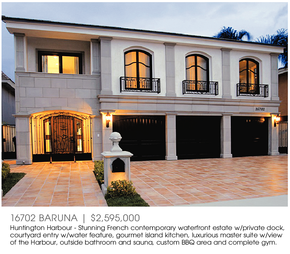 16702 BARUNA | $2,595,000 Huntington Harbour - Stunning French contemporary waterfront estate w/private dock, courtyard entry w/water feature, gourmet island kitchen, luxurious master suite w/view of the Harbour, outside bathroom and sauna, custom BBQ area and complete gym.